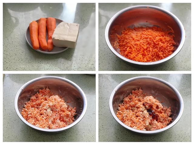 ?、佟⑿迈r的胡蘿卜清洗干凈,削去皮后然后擦成細(xì)絲,較粗一點(diǎn)的擦板擦出來的胡蘿卜絲,需要再切碎一些,如果用特別細(xì)的擦板就不用了再切一下了,擦好后的胡蘿卜絲撒少許的鹽腌出水分,然后將豆腐用手捏碎,與胡蘿卜混合均勻,接著加入淀粉、蠔油、雞精、食用鹽、滴幾滴香油,用手抓勻就好了。(胡蘿卜含有豐富的水分,如果做餡的話需要擠掉一些水分,做這道胡蘿卜豆腐餅的話就不需要擠掉水分,胡蘿卜汁中的營養(yǎng)價(jià)值也能不被丟棄。)