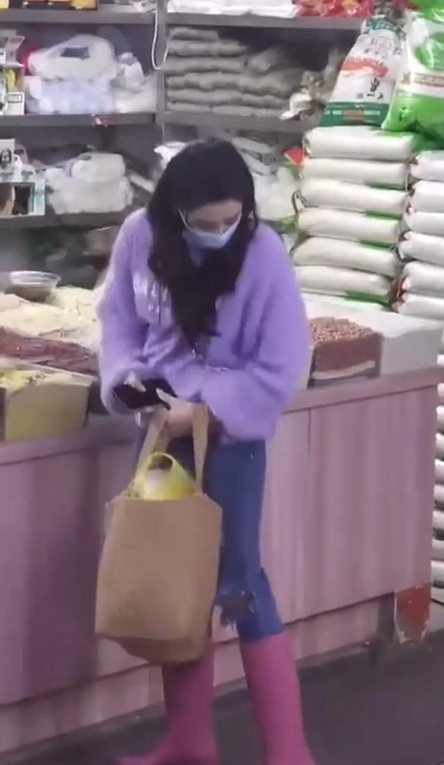張柏芝這次在旅行中買蔬菜,服裝真的很流行,上半身紫色毛衣上有洞牛仔褲,腳上踩著粉紅色的油漆雨靴,花里胡哨的服裝完全不像孩子的辣媽嗎,年輕美麗。
